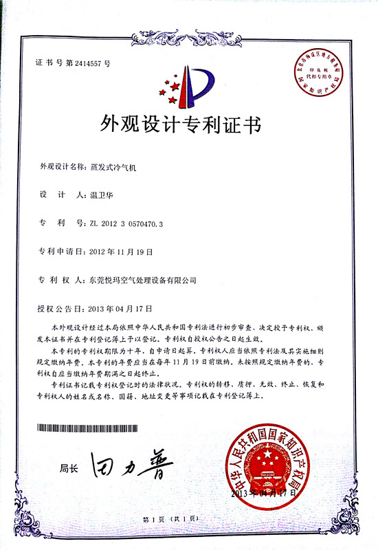 蒸發式冷氣機外觀設計專利證書2021-04-29 15:12:03   點擊:3118